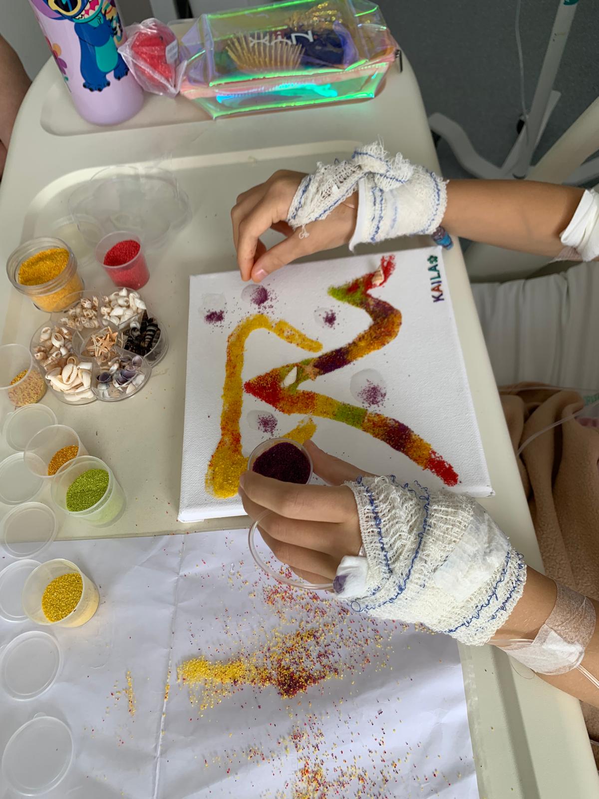 Décodeur : K., 9 ans est placée en famille d’accueil (lieu où il n’y a pas de violence, explique-t-elle). La petite nièce du sacristain la rencontre en service protégé d’hémato à l’hôpital le lendemain du jour où le médecin annonce à sa famille d’accueil qu’elle souffre d’une leucémie. K. réagit de manière enthousiaste à la proposition de réaliser une œuvre pour le "111 des arts". Deux mains bandées et porteuses de cathéters ne l’empêchent nullement de réaliser une montagne "licorne" (arc-en-ciel) en sable coloré, réchauffée par un soleil si tenace qu’il tord ses rayons pour éclairer l’adret et l’ubac !