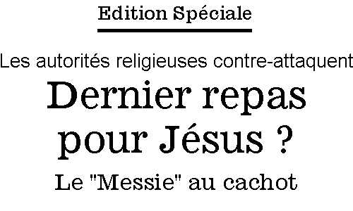 La soirée n'a pas été de tout repos pour Jésus et ses disciples et beaucoup se demandent si ceci est l'assaut final donné par les autorités contre "le provocateur". Alors que la population n'a pas vraiment pris conscience de ce qui se passe, essayons de reconstituer chronologiquement les faits.