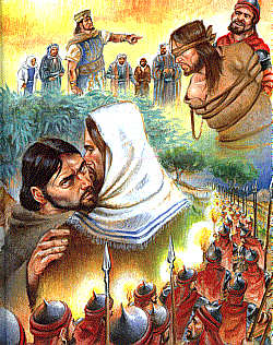 Soudain, le calme a été rompu. Judas Iscariote est revenu. Et pas seul, cette fois-ci. Il était à la tête d'un commando recruté par les grand-prêtres et les pharisiens. Une troupe considérable, cagoulée, avec torches et armes. Judas s'est approché pour saluer Jésus et immédiatement, les soldats se sont emparés de lui.